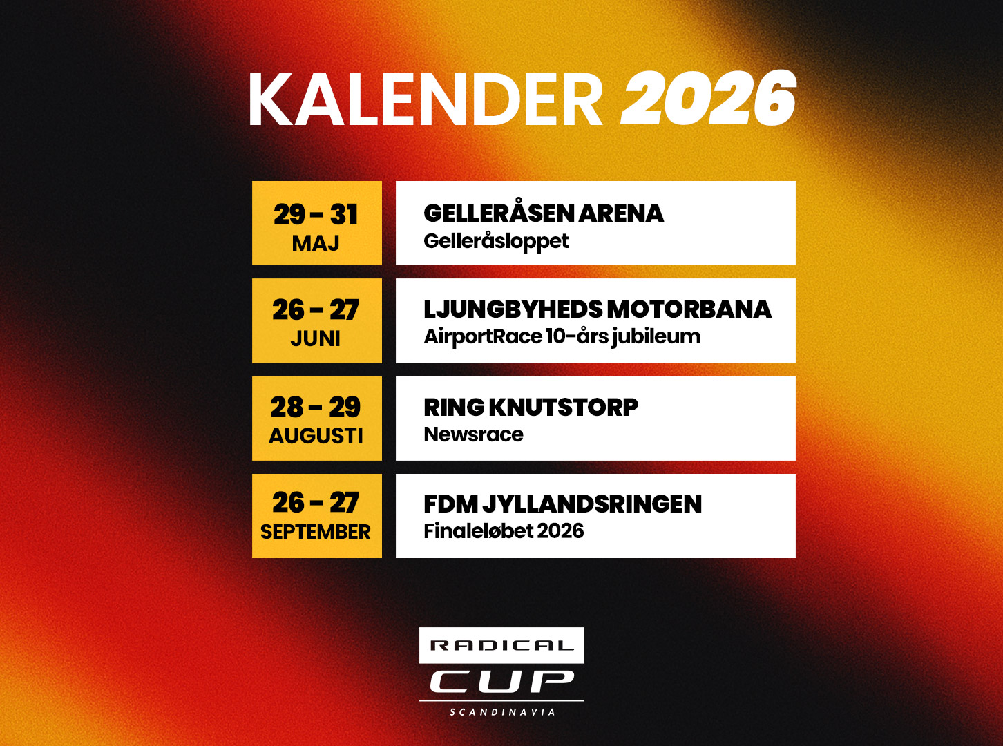 Radical Cup Scandinavia presenterar nu en kraftfull tävlingskalender för 2026 med fyra deltävlingar på några av de mest uppskattade banorna i Sverige och Danmark. Serien tar nästa steg i sin utveckling med ett fräscht och genomtänkt koncept där kvalitet, gemenskap och upplevelse står i centrum.
